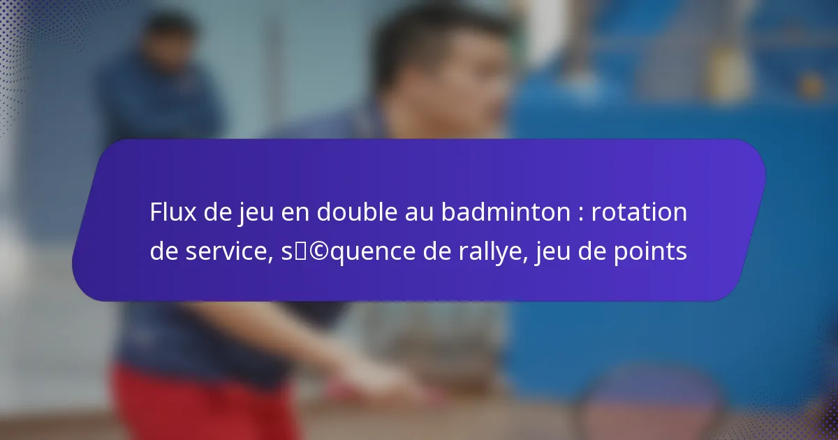 Le badminton en double implique un flux de jeu structuré qui comprend la rotation des services, les séquences de rallye et le jeu de points. La rotation des services garantit l’équité en permettant aux joueurs d’alterner les services, tandis que la séquence de rallye dicte comment les équipes interagissent pendant le match. Maîtriser ces éléments, ainsi qu’une communication efficace et une stratégie, est essentiel pour maximiser les opportunités de marquer et réussir sur le court.